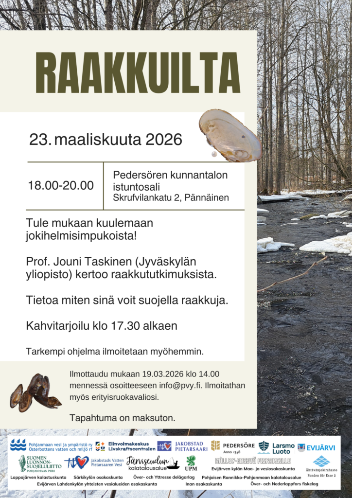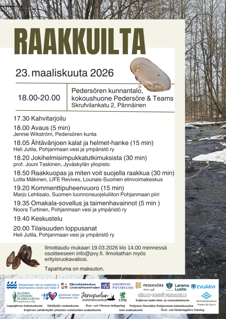 Tervetuloa Raakkuiltaan 23.3.2026 Artikkeli julkaistu:26.2.2026 Avainsanat: jokihelmisimpukka, raakku, raakkuilta, raakkututkimus, suojelu Lue lisää artikkeleita Previous PostTarjouspyyntö: Raakkuselvitykset Ähtävänjoella, Ähtävänjoen kalat ja helmet -hanke Seuraava artikkeliKiitos yhteistyöstä kalastuskunnat!
