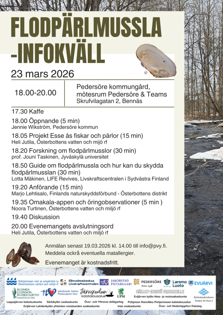 Välkomna på infokväll om flodpärlmussla den 23.3.2026, se kvällens program Datum och tid: 23.3.2026 kl. 18:00-20:00Plats: Pedersöre kommungård, mötesrum Pedersöre & Teams (Raakkuilta / Flodpärlmussla – infokväll | Mötesanslutning | Microsoft Teams)Språk: Tvåspråkigt evenemang (finska och svenska)Arrangörer: Österbottens vatten och miljö rf och Finlands naturskyddsförbund – Österbottens distriktPå bilderna flodpärlmussla. Foton: Heli Jutila, 14.6.2025. Inlägget publicerat:26.2.2026 Etiketter: esse ås fiskar och pärlor, flodpärlmussla Läs fler artiklar Föregående inläggVatteninfokväll 17.2.2026 Nästa inläggTack för samarbetet FISKELAG!