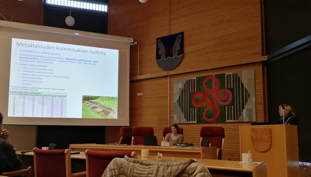 Hannes-myrskyn aiheuttamat metsätuhot puhuttivat jonkin verran. Kysymyksiä heräsi mm. puumateriaalin päätymisestä veteen ja sen poistotarpeesta. Jutila muistutti puumateriaalin hyvistä puolista. Puumateriaalin esiintyminen vesistöissä on luonnollista ja ne toimivat myös kuormitusta hillitsevinä tekijöinä. Rannan puut varjostavat vesistöjä pitäen lämpötilan siedettävämpänä vesieliöille.