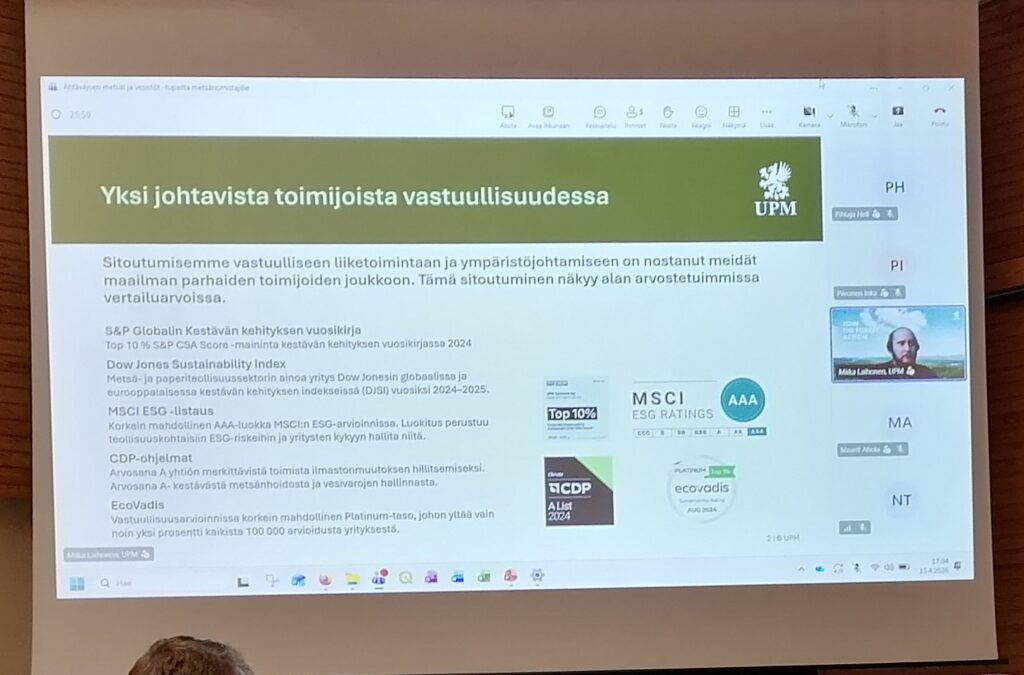 Tapahtuma aloitettiin kahvituksella. Ensimmäisenä esiintyjänä oli UPM Metsän luonnonhoidon asiantuntija Miika Laihonen, joka kertoi UPM:n vastuullisuustoimista ja monimuotoisuuden tukemisesta. Esimerkkinä Laihonen kertoi myös käynnissä olevasta projektiyhteistyöstämme ojitetun suon ennallistamiseksi UPM:n kiinteistöllä Evijärvellä.